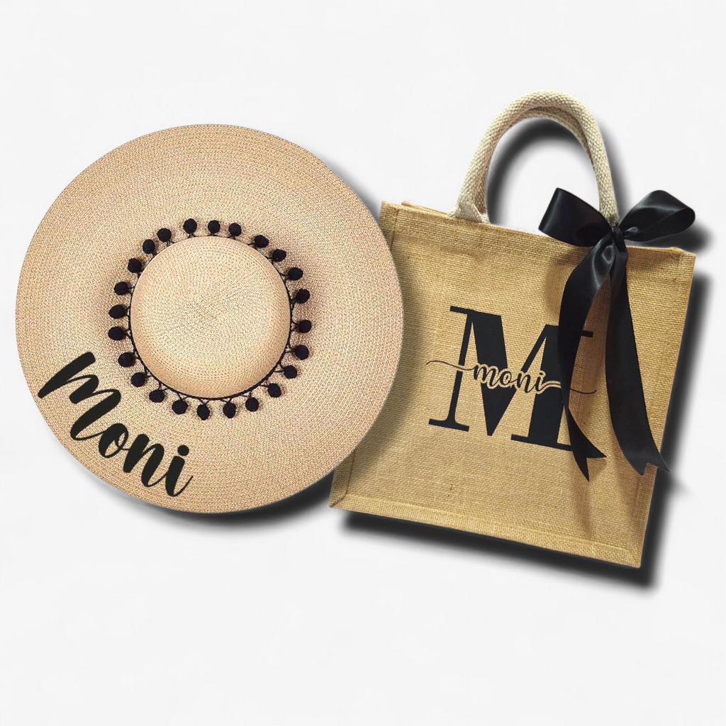 Paquete con bolsa de playa con listón y sombrero de playa ambos personalizados.